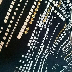 No additional discounts unless bundled, poncho style top black background with lots of white block graphics plus gold studs; 60% cotton 40% modal for great stretch and comfort; wide open armholes 11" long; Rock & Republic brand; size L; measured laying flat bust 20"; shoulder to hem 20" - slightly longer in back (T-1)