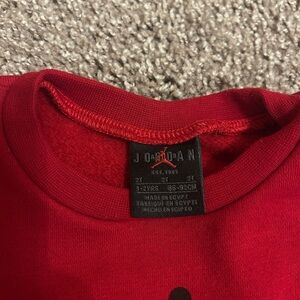Bold red Jordan set with iconic logo. Comfortable fit for active kids. Features stylish black accents.