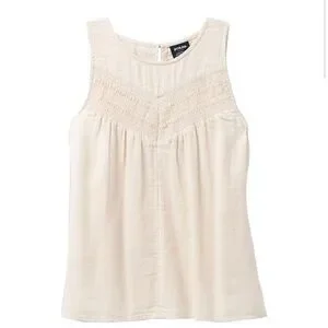 Soft, feminine prAna Seakissed Sleeveless Tank Top in a versatile beige / cream neutral. This relaxed, flowy top features beautiful front panel smocking and lightweight 100% organic cotton for breathable comfort.
