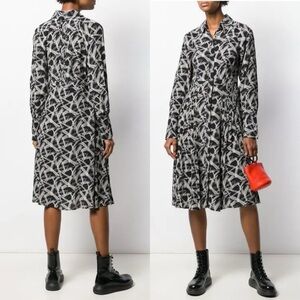 Stylish midi dress with a button-up front. Features a black and white abstract pattern. Long sleeves and a classic collar.