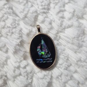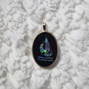 Vintage 14k yellow gold onyx cluster inlay Austrian opal mosaic sailboat pendant.