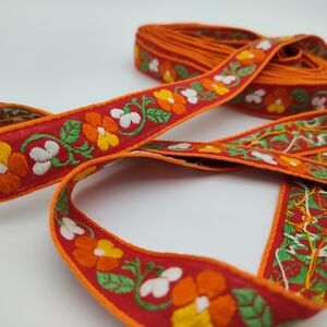 This is a true woven jacquard ribbon (not printed), featuring vibrant red and orange tones with multicolor floral detailing. A striking and versatile vintage textile—ideal for luxury gift wrapping, sewing accents, fashion trims, and elevated seasonal styling.