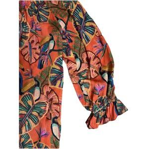 This stunning Anthropologie dress is a must-have for any fashion-forward woman. The dress features a unique one-sleeve design and a vibrant floral and toucan print that is sure to turn heads. The pullover design and balloon sleeve make this dress comfortable and easy to wear, while the ruffle accents and stretchy viscose fabric add a touch of luxury.