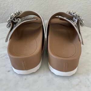 Description: “Slip on, double strap, jewel buckle, metallic. Composition: leather upper, synthetic lining and sole.”
