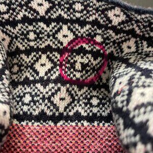 Cozy Maeve by Anthropologie turtleneck sweater featuring a classic Fair Isle Nordic knit pattern with bold pink and orange stripe accents along the sleeves. Soft, textured knit with a relaxed silhouette that’s perfect for cold weather layering. A standout statement sweater with cottagecore and cozy alpine vibes.