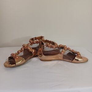 They're so shiny! Liven up any outfit with these wonderful sandels. One tiny mark on one of the gold balls across the toes. See picture. Otherwise in perfect condition.