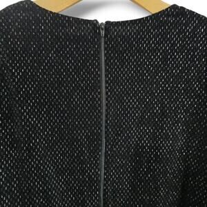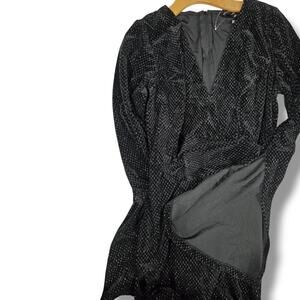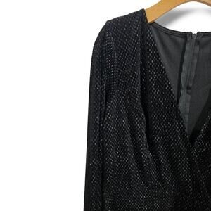 Elegant Symphony black lurex dress featuring a deep V-neckline, flowing batwing sleeves, and a flattering fitted waist. Made from a soft, stretchy polyester-spandex blend that shimmers beautifully under the light. Perfect for parties, holiday events, or evening occasions. New with tags. Approximate measurements when laying flat: 38.5" length x 44" chest x 34" waist.