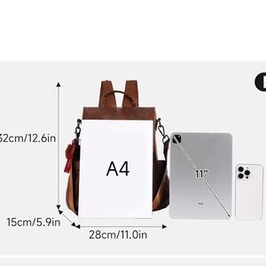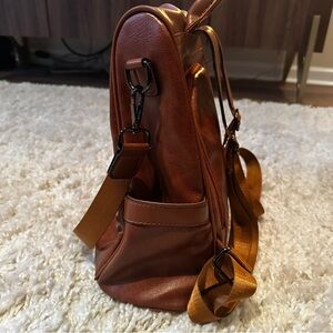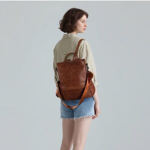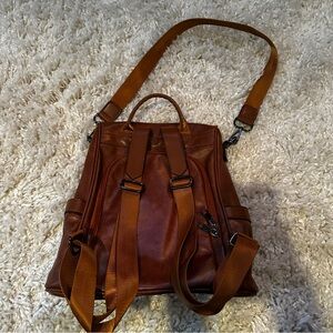 Stylish and durable brown leather womens’ backpack, perfect for everyday use. Features a sleek design with ample storage space. It’s a great piece to add to you collection. It’s also great for travel. I loved this piece but it’s time to move one. Minimal wear. Please review ALL pictures before purchasing. Feel free to ask me any questions. Thank you!
