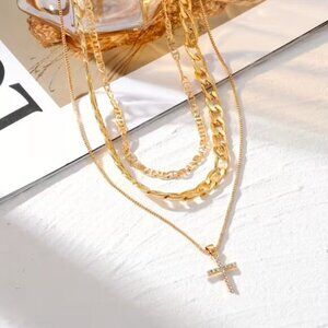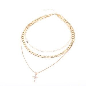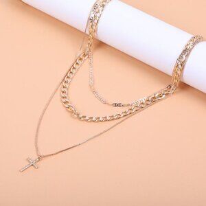Gold Layered Chain Necklace Cross Pendant Choker Statement Fashion Faith Jewelry