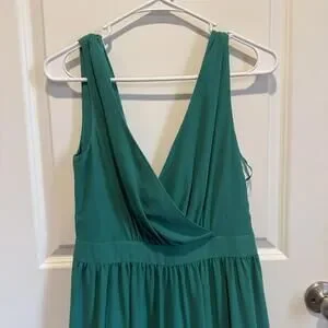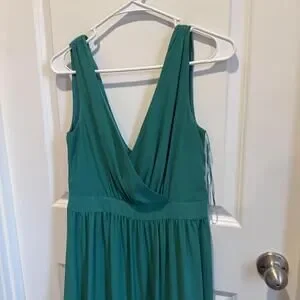Elegant emerald green sleeveless maxi dress by Badgley Mischka. Features a deep V-neckline with a gathered waist for a flattering silhouette.