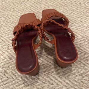 STAUD Frankie Tan Brown Ruched Leather Block Heel Sandals Slides, size 38. In great condition! Step out in style with these elegant tan block heel sandals. Perfect for any occasion, these shoes offer both comfort and sophistication.