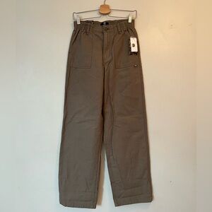 Brand new. 100% cotton, deep olive green, size xs, wide/straight leg, relaxed fit.