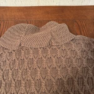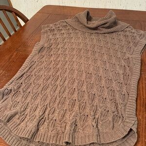 Elegant cowl neck sweater with intricate knit design. Sleeveless style for versatile layering. Rich brown color adds warmth.