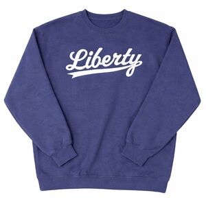 Navy blue crewneck sweatshirt featuring a bold Liberty script graphic across the front. This pullover has a classic crew neckline, long sleeves, and a relaxed everyday fit. Made by the brand Gildan for comfortable casual wear and easy layering.