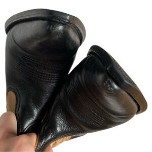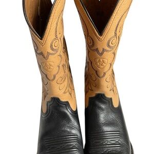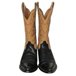 These are a unique two tone design, with a camel toned leather on the upper shaft of the boot and a black leather on the bottom.