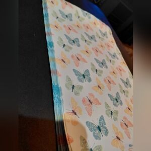 Colorful butterfly a must-have staple to brand your closet. Features orange, green, and blue butterflies on a white background. From a non-smoking and pet-free home.