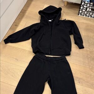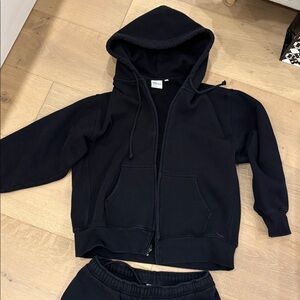 Aritzia TNA Sweatflece Cozy Fleece Mega Fit black matching sweatsuit. Zip up medium sweatpants small.