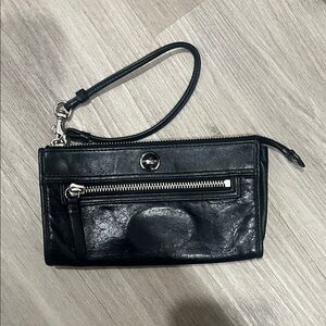 Sleek black leather wristlet. Features zippered pocket. Silver hardware accents. Detachable wrist strap.