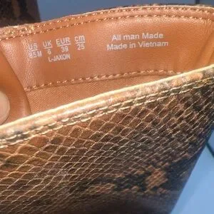 Heeled Boot in snakeskin embossed faux leather, size 8.5M, features a pointed toe, high block heel, and comfortable vegan lining. This stylish Western boot is perfect for the colder seasons of winter, fall, and spring, with a versatile color combination of brown and black. The synthetic outsole and mid-calf shaft style make it both fashionable and durable, ideal for a variety of occasions ranging from art festivals to city outings. With its unique design and quality construction, the Franco Sarto Jaxon boot is a standout choice for any fashion-forward woman.