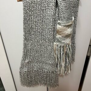 Cozy scarf with intricate knit design. Features soft gray and cream tones. 80 inches long plus 8” fringe x 11” wide. Worn once!! Super cozy