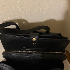 Stylish black leather handbag by Myabetic. Features gold accents and a sleek design. Approx measurements 13 inches front from one end to other height about 9 inches dust bag included shown in pictures has a pocket to help add any additional diabetes supplies (see pictures)
