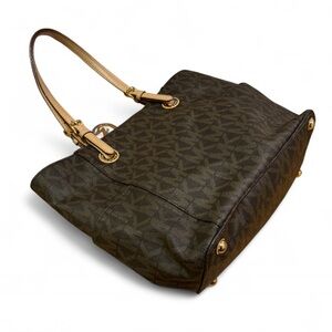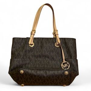 Elegant tote with iconic MK pattern. Features sturdy tan handles. Ideal for everyday style. Lots of storage space, several zipper areas, can hold laptop / iPad and more! Gently used if at all, still in like new condition.