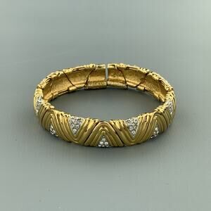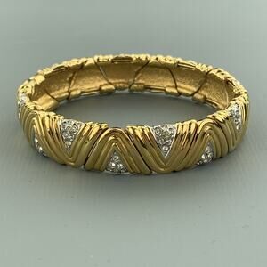 Vintage Gold Tone Metal Rhinestones Textured Open Cuff Bracelet
