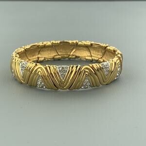 Vintage cuff bracelet comes in yellow gold tone textured metal with silver tone rhinestone panels and slit back.