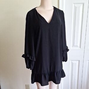 Chic black dress with V-neck. Features ruffled sleeves and hem. Perfect for versatile styling. 33 long, ptp 20, sleeve 21.