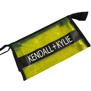 Kendall + Kylie clear cosmetic pouch in a vibrant translucent yellow PVC finish with black trim and zip closure. Features a detachable wrist strap and bold logo panel across the front. Lightweight, wipe-clean, and perfect for travel, makeup storage, or on-the-go essentials.
