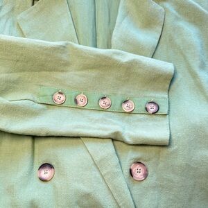Free People Olivia Blazer in Grassland Green, linen blend, double-breasted with tie belt, long sleeves, and front pockets. Condition: Pre-Owned Excellent, Size: XS. Approx measurements: 19” pit to pit, 28” length. Retail: $178+. Ships fast from Kourtney’s Kloset