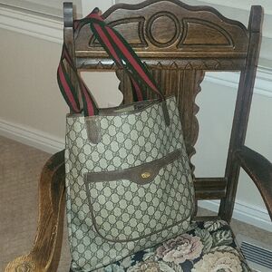 Stylish Gucci tote with monogram on canvas. Features beige and brown tones with brown leather trim. Bottom 4 corners are split.
