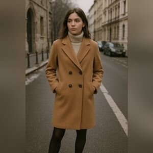 Elegant and timeless camel coat by Cabi, crafted in a warm wool-blend fabric with a soft, structured feel. Features a flattering tailored silhouette, double-breasted front, and functional side pockets. This versatile neutral piece transitions effortlessly from workdays to weekends — perfect for layering over denim or dresses.