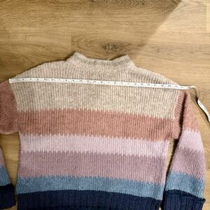 Soft knit with blush, cream, and blue stripes + subtle metallic detail at the neckline. Slightly cropped, comfy fit.