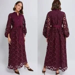 Made in a beautiful lace fabric, this maxi is a chic and timeless piece meant to be worn season after season. Boasting blouson sleeves, A-line silhouette, and a self-tie waist belt, this Merlot Calliope Dress is both flattering and classic. Simply add heels and clutch - you're ready to roll for any event on your social calendar! Our Favorite Details: Front button placket Side pockets Self-tie waist belt (included) Partially lined Material: 100% Cotton (body & yoke), 100% Viscose (lining)