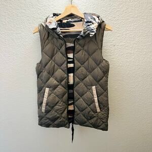 Reversible lightweight down puffer vest with hood. Two looks in one: diamond-quilted champagne side and Cashew Coast camo print side. Warm yet packable—great for layering, athleisure, and everyday wear.
