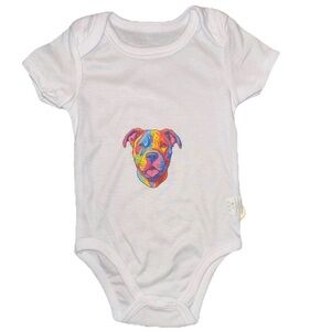 Adorable baby onesie with a colorful dog print. Soft and comfortable fabric.