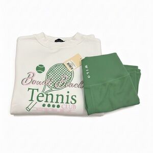 Stay stylish and comfortable with the WILO Women's Tennis Sweater. Featuring a chic white base with green tennis-themed graphics, this sweater is perfect for casual outings or a day on the court. Also with green athletic shorts. Please keep in mind sweaters are oversized and shorts run true to size.