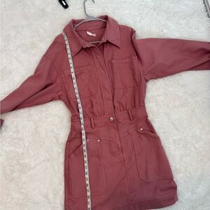 Chic pink utility jacket with front pockets. Button-up design with a classic collar. Perfect for layering. See similar styles in pictures. No notable flaws. May be missing belt sash, but honestly doesn't really need it.
