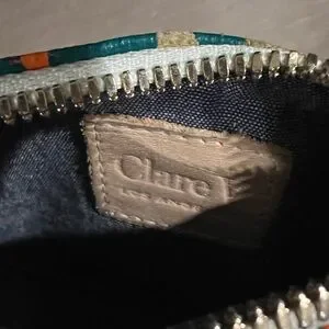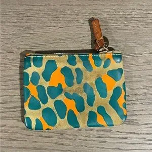 Stylish wallet with a multicolor abstract anima print design. Features a secure zip closure. Clare V metal logo tag at zipper and interior leather patch. Chambray lining. Ideal for everyday use. Some discoloration on one side (shown in photo). 5 1/4” length x 4” height.