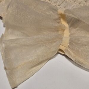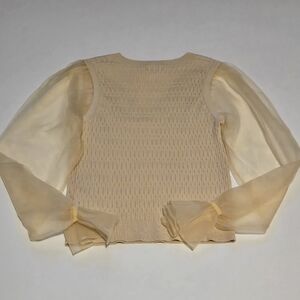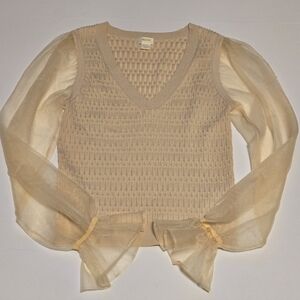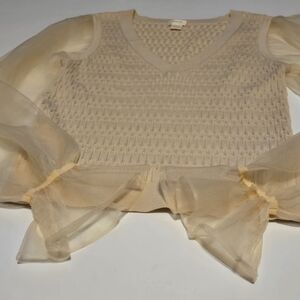 MAEVE by Anthropologie cream knit top featuring stunning sheer organza puff sleeves and a textured stretch knit bodice. The perfect blend of soft elegance and modern detail — ideal for romanticcore, coquette, and dressy-casual styling.