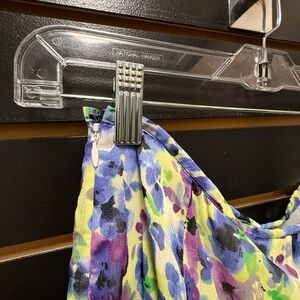 Beautiful lightweight skirt featuring a colorful floral print in shades of blue, purple, green, and yellow. Soft, flowy silhouette with a flattering drape. Fully lined for comfort and finished with a side zipper for a smooth, clean fit.