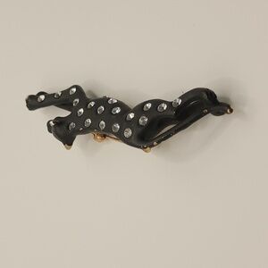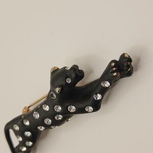 Description and Features: Cheetah Leopard Cougar Brooch Pin Enamel with Rhinestones. Black Enamel Pant with Gold Paint Accents and Clear Rhinestones That Catch The Light And Produce Lovely Prism Rainbow Effects. VTG 80s 90s Bling Sparkle Jewelry.