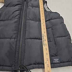 The Abercrombie & Fitch black puffer vest features a removable hood with fur trim, full zip closure, and a sleeveless design. Perfect for outdoor activities with a preppy Y2K theme, this vest also has quilted and logo accents for added flair. Stay warm and fashionable with this versatile piece that can be dressed up or down for any occasion.