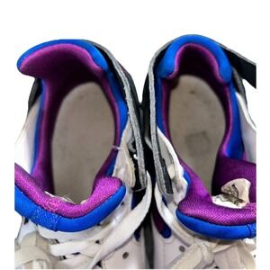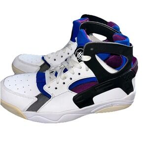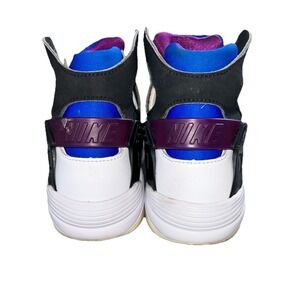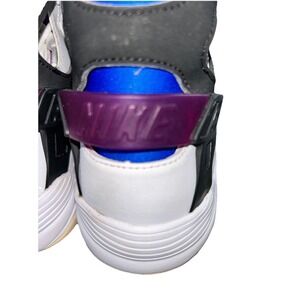 Elevate your young athlete's style and performance with the Nike Boys 5.5Y Air Flight Huarache running shoes. The iconic design features a white leather upper with vibrant purple and blue accents that make a statement on the track or the playground. The lace-up closure ensures a secure fit for all-day play, while the mid-top shaft style offers supportive comfort.