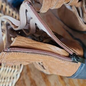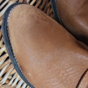 Preowned. Soles have scuffing and wear. Leather uppers have some scuffs, but a nice distressed look. Insoles are clean with no issues. Leather is nice and soft. Zippers in working order. 10" from toe to heel. Heels are 3.5"