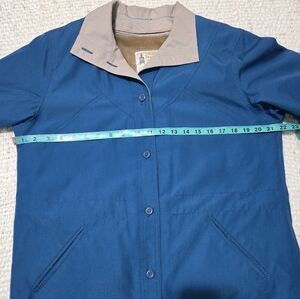 This classic women's coat is in a blue and tan color scheme. It has a removable faux fur tan lining, four pockets in front, button closure, and inner cinchable drawstring. It also has pleating in the upper back area. The sleeve cuffs have double buttons. There is no hood. Designed for comfort and durability.