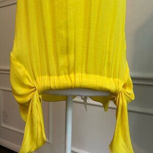 Brighten your wardrobe with this vibrant yellow V-neck top. Perfect for casual outings, this top offers a comfortable fit and stylish design. Has a beautiful knotted detail. #yellowtop #nakedzebra #nakedzebratop #yellowtopsizesmall #sizesmalltop