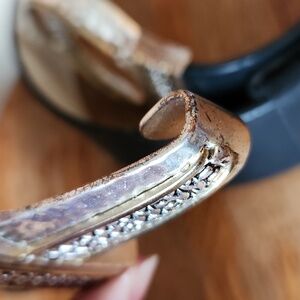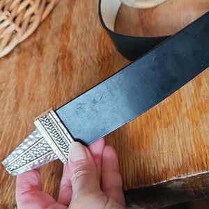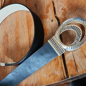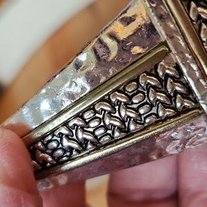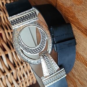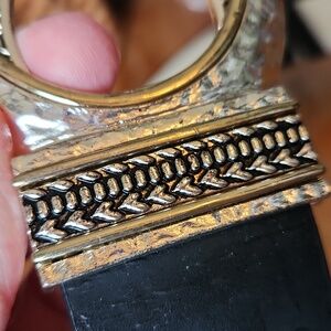 Hammered silvertone with goldtone accents buckles, Hook closure. Leather belt.