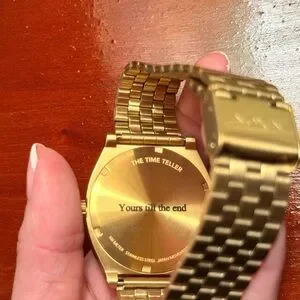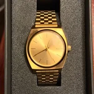 Stylish Nixon watch in a gold finish. Features a minimalist round face. Durable link band with secure closure. Perfect for any occasion. Engraved on the back, never before worn, in original box.